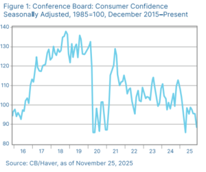 Consumers appear to be noticing these headwinds, as consumer confidence continued to falter in November. The Conference Board’s Consumer Confidence Index fell more than expected in November. As seen in Figure 1, this brought confidence to a seven-month low. The headline drop in consumer confidence was driven by rising concerns about the present economic situation as well as souring expectations for the future. Historically, consumer confidence has been a driver of consumer spending, so this is an important area to keep an eye on in the months ahead.