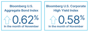 The 10-year Treasury yield fell from 4.13 percent at the start of November to 4.02 percent at the end of the month. The Bloomberg Aggregate Bond Index gained 0.62 percent in November. High-yield fixed income was also up, with the Bloomberg U.S. Corporate High Yield Index gaining 0.58 percent. High-yield credit spreads ended the month slightly higher.