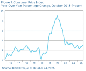 Bond returns were positive as well in October, driven in part by a 25 basis point rate cut at the conclusion of the Federal Reserve’s October meeting. This now marks two consecutive meetings with rate cuts, and further cuts are expected in early 2026.