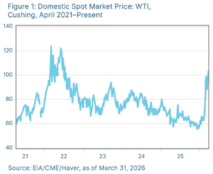 Energy prices remained high and volatile throughout March, with rising crude oil prices in the spotlight. As seen in Figure 1, domestic oil prices rose to over $100 a barrel toward the end of the month, which is the highest we’ve seen since 2022 following the Russian invasion of Ukraine. If higher energy prices persist, this would likely serve as a headwind for future economic growth and lead to rising inflationary pressure.